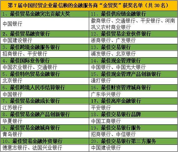 作为业内最知名的交易银行生态圈奖项之一,在第7届中国经贸企业最信赖的金融服务商评选中,评委会在各银行包括公司部、交易银行部、贸金/国际部、结现部等多个部门自愿申报的前提下进行了严格筛选,从众多申报单位中,根据多个维度甄选了部分优秀代表,以期表彰先进、树立标杆、分享价值,从而带动整个交易银行行业的持续、稳步发展。